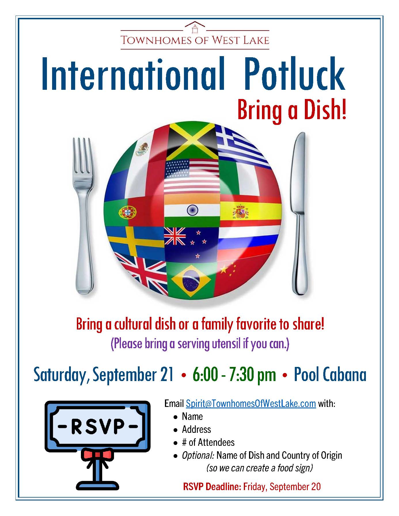 West Lake’s International Potluck Dinner – September 21 at 6 pm